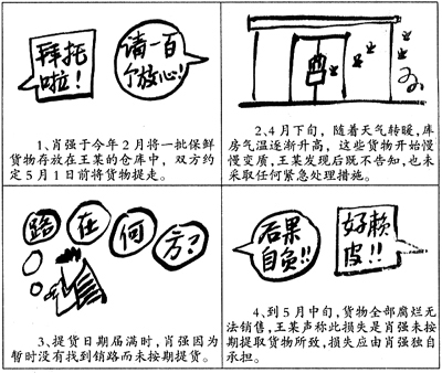 本案中肖强与王某之间实际上形成了一种仓储保管合同关系,他们之间的权利义务应适用合同法中关于仓储合同的有关规定来调整。按照合同法第三百八十九条规定:“保管人对入库仓储物发现有变质或者其他损坏的,应当及时通知存货人或者仓单持有人。”肖强将货物存入王某的仓库,王某在保管期间发现货物有变质后,应及时告知肖强,以便采取措施进行补救处理,所以他对货物的最终全损是存有一定过错的。作为肖强来说,他将货物存放入库后,也应按照仓储合同的约定按时提取货物。合同法第三百九十二条规定:“储存期届满,存货人或者仓单持有人应当凭仓单提取仓储物。”合同法第三百九十三条规定:“储存期届满,存货人或者仓单持有人不提取仓储物的,保管人可以催告其在合理期限内提取,逾期不提取的,保管人可以提存仓储物。”所以肖强存放的货物出现全损的后果,主要过错还在他自己,其逾期提取货物造成的损失主要应由他自己来承担。而王某在仓储合同约定的保管期内,也未完全尽到保管人的义务,对货物的变质具有一定过错,也要承担一定的责任。