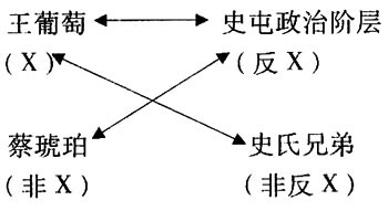 其次,根据格雷马斯的“矩阵模式”,为了表现人性的复杂,表现政治对人性的束缚和摧残,严歌苓还设置了另外一组有着微妙关系的人物群像,他们的出现既鲜活了史屯政治斗争的严肃画面,又不失时机地对政治形成反讽力量;既丰富了民间的生活,又显示出历史的荒谬。这就是忽而代表着光荣政治,忽而又被光荣政治毫不留情地抛弃的一群人。简言之,我们可以将蔡琥珀设为非X项,将史氏兄弟(史冬喜、史春喜)设为非反X项。