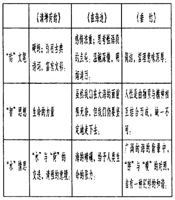 这个小组的学生很有创意,关注到主题“水之韵”,并且用“水”、“智”(“之”)、“韵”三个字串起这三篇文章,从情思、思想和文笔三方面进行分析。在交流发言时,更采用以中心发言人辐射到小组其他成员,各有所思,各有所言。