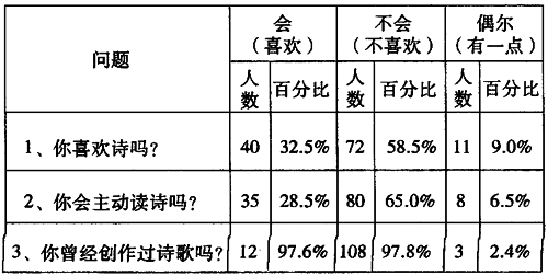 另外,现在人们对业余文化生活的选择中,对诗歌还仍然作为活动内容而进行选择的只占2.4%还不到,而选择上网冲浪的占到了56.9%以上。可见,大众文化的发展对传统意义上的诗歌的发展的冲击是巨大的。
