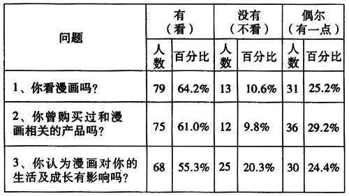 另外,在看漫画的79人中选择中国大陆漫画的有44人,占55.7%,选择中国台湾漫画的有65人,占82.3%,而选择日本漫画的有77人,占97.5%,成为了当之无愧的绝大多数。