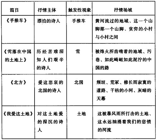 这四首中的抒情主体对民族都是充满关切和热爱的。而《雪落在中国的土地上》中的“苦难的浪涛曾经几次把我吞没又卷起”,还有《手推车》中的“单独的轮子”,又暗示了抒情主体的忧郁和苦难。所以我可以将这几首诗歌当中的抒情主体概括为:关切民族的忧郁抒情者。而这几首诗中的触发性视象同时也是贯穿全诗的中心意象,它们都来自现实生活,并灌注了诗人强烈的情感,同时,也可以当作某种象征。最后来看抒情场域,这几首的抒情场域都是充满苦难的现实世界,对抒情主体构成巨大的召唤力。