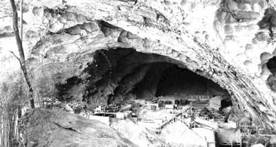 这是一个建在洞穴里的“部落”,洞深230米,宽115米,高近50米。房屋建在冬暖夏凉的洞穴中,饮水来自洞顶滴水,谷物种植在洞口附近的山坡上;清一色竹制的房子、牲畜棚圈和厕所,沿着洞穴内侧围成半圆;最深处是洞中的小学,操场上高悬的竹帘上书“严教勤学,面向未来”8个大字,学生们已经放假,在洞中享受他们的假期;只有50岁以上的妇女,还穿着带有苗族印迹的传统服装,年纪稍长的人只会讲几个简单的汉语单词;一些人家的主要劳动力外出打工,留在家的都在忙着从山下运砂石修水窖,水窖修好,会缓解洞内取水难的危机。