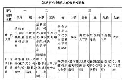 从上可见,《三茅表》结构在某种程度上遗存着古代"章表"之旧式,其音乐结构形式是以宫廷祭祀乐章为基础,承袭了《唐代大曲》的某些因素,在衍变发展的过程中日趋通俗化。