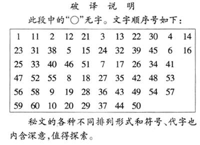 秘文都是二十个字一行,组成大小不同的方形体;除文字外,还有一些符号和代字。按多种不同的规律错杂排列,真成为令人不可思议的“天书”了!