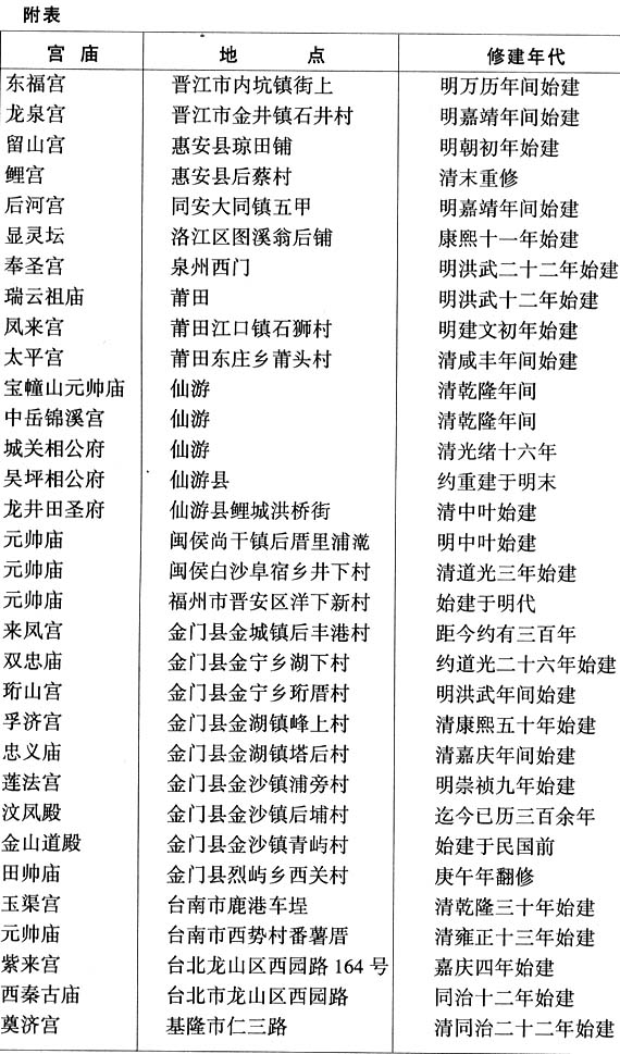 ⑧本表依据杨天厚、林丽宽《金门寺庙巡礼》(稻田出版有限公司1998年),林胜利、李辉良主编《戏神雷海青信仰研究》(中国广播电视出版社2002年)等著作整理而成。