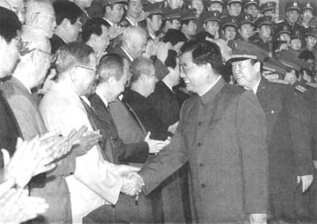 晚7时许,胡锦涛等军委领导在中央军委委员、第二炮兵司令员靖志远,政治委员彭小枫的陪同下,来到第二炮兵机关。在认真听取了二炮领导同志的汇报后,胡锦涛亲切会见了二炮机关师以上领导干部,以及老同志和英模代表,并发表了讲话。他首先代表党中央、中央军委,向为二炮组建和发展作出重要贡献的老领导、老专家、老同志和英模代表致以崇高的敬意,向二炮全体官兵、职工表示亲切的问候。