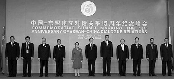 10月30日,中国—东盟建立对话关系15周年纪念峰会在广西南宁荔园山庄国际会议中心举行。中国国务院总理温家宝与文莱苏丹博尔基亚、柬埔寨首相洪森、印度尼西亚总统苏西洛、老挝总理布阿索内、马来西亚总理巴达维、缅甸总理梭温、菲律宾总统阿罗约、新加坡总理李显龙、泰国总理素拉育和越南总理阮晋勇共同出席会议。会议由温家宝和东盟轮值主席国菲律宾总统阿罗约共同主持。