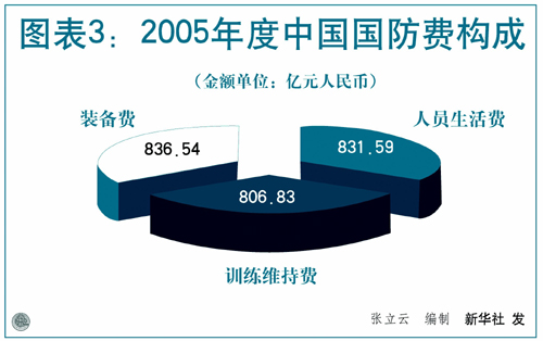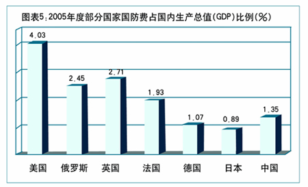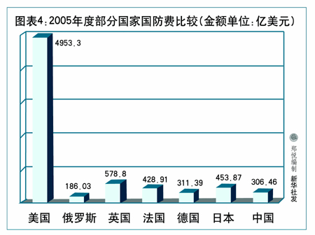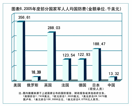 中国国防费总额、军人人均数额,与其他一些国家特别是大国相比仍处于较低水平。2005年,中国年度国防费相当于美国的6.19%、英国的52.95%、法国的71.45%、日本的67.52%。中国国防费军人人均数额为107607元人民币,是美国的3.74%、日本的7.07%。
