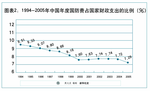 2004年、2005年中国国内生产总值(GDP)分别为159878亿元人民币和183085亿元人民币,分别比上年增长10.1%和10.2%。国家财政支出分别为28486.89亿元人民币和33930.28亿元人民币,分别比上年增长15.57%和19.11%。2004年、2005年,中国年度国防费分别为2200.01亿元人民币和2474.96亿元人民币,分别比上年增长15.31%和12.50%。两年来,中国年度国防费占同期国内生产总值和国家财政支出的比例有所下降,2003年分别为1.40%和7.74%,2004年分别为1.38%和7.72%,2005年分别为1.35%和7.29%。2006年,中国国防费年度预算为2838.29亿元人民币。
