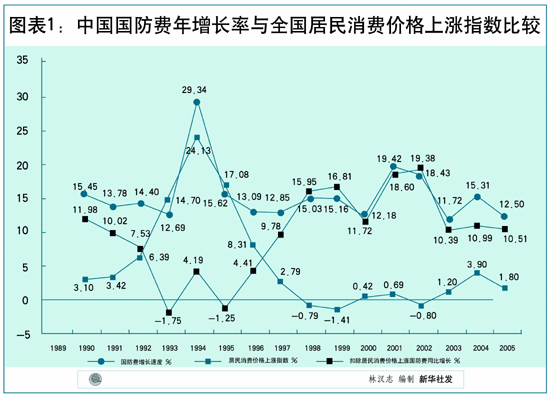 20世纪90年代以来,中国在经济发展的基础上,为维护国家主权和安全统一,适应世界新军事变革的发展,保持了国防费的逐步增长。但是,这种增长仍属于弥补国防基础薄弱的补偿性增长,是与国家经济发展相协调的适度增长。20世纪80年代,国家的工作重点开始转移到经济建设上来,强调国防建设服从和服务于经济建设大局,国防建设处于低投入和维持性的状态。从1979年到1989年,国防费年平均增长为1.23%,与同期全国居民消费价格总指数年平均上涨7.49%相比,实际年平均负增长5.83%。从1990年到2005年,国防费年平均增长为15.36%,扣除同期全国消费价格总指数年平均上涨5.22%,实际平均增长9.64%。