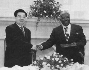 2月3日,胡锦涛同姆瓦纳瓦萨举行会谈并共同出席两国合作文件签字仪式。