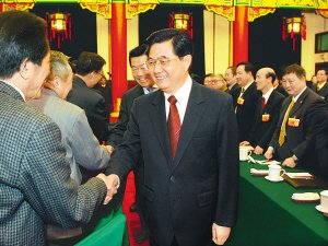 3月7日下午,胡锦涛看望了工会、共青团、青联、妇联的全国政协委员并参加了联组讨论。委员们争相发言,积极建言献策,会场气氛十分活跃。在认真听取了海飞、张俊九、莫文秀、冯巩等14位委员的发言后,胡锦涛说,构建社会主义和谐社会是艰巨复杂的系统工程,只有动员广大人民群众共同参与,才能使这一宏伟目标变成现实;构建社会主义和谐社会是造福全体人民的伟大事业,只有让广大人民群众不断从和谐社会建设中得到实惠,才能使和谐社会建设成为广大人民群众的自觉行动。胡锦涛强调,一定要在党的领导下,尊重人民群众的主体地位和首创精神,最大限度地激发广大人民群众的参与热情和创造活力,最大限度地实现好、维护好、发展好广大人民群众的根本利益,把共同建设、共同享有和谐社会贯穿于和谐社会建设的全过程,真正做到在共建中共享、在共享中共建。胡锦涛强调,群众工作是我们党的政治优势和优良传统。在改革发展进入关键时期的新形势下,加强和改进群众工作尤为重要。工青妇组织是党开展群众工作的重要力量,要在社会主义和谐社会建设中充分发挥组织群众的作用,动员广大职工、青年、妇女群众踊跃投身构建社会主义和谐社会的实践;充分发挥引导群众的作用,努力在广大群众中形成牢固的共同思想道德基础;充分发挥服务群众的作用,多为广大群众做好事、办实事、解难事;充分发挥维护群众合法权益的作用,倾听群众呼声、反映群众诉求,为共同建设、共同享有和谐社会作出积极贡献。贾庆林一同参加了讨论。
