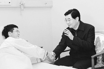 胡锦涛说,听到你患病的消息,我很牵挂。军委、总部和海军,以及解放军总医院都很关心你,为你的治疗作了精心安排。希望你安心养病,早日康复!