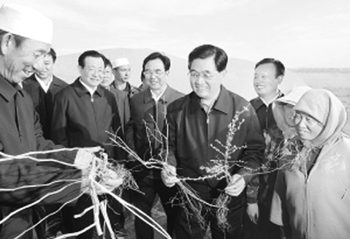 干旱少雨,沙漠肆虐,生态脆弱,给宁夏不少地区群众生产生活带来严重困难。胡锦涛十分牵挂干旱地区人民,考察期间,多次顶着风沙,走荒漠,登沙丘,同当地干部群众共商发展大计。