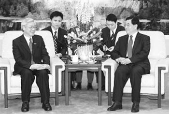 4月9日,全国人大常委会委员长吴邦国在人民大会堂与阮富仲举行会谈,双方在友好的气氛中就双边关系、议会交往和共同关心的其他重大问题深入地交换了意见,达成重要共识。