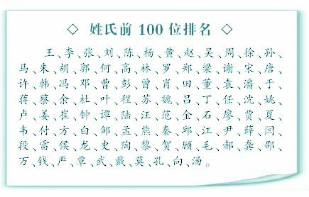 据介绍,我国第二大姓是李,有9207.4万人,占全国人口总数的7.19%;第三位是张姓,有8750.2万人,占全国人口总数的6.83%。前100个姓氏总人口占全国人口的84.77%。