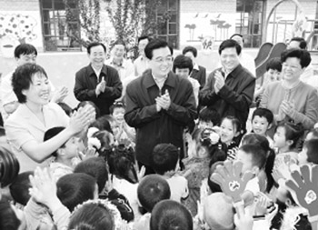 在幼儿园的小院子里,胡锦涛兴致勃勃地观看孩子们自编自演的节目。表演结束后,大家兴奋地围拢到胡锦涛身边。胡锦涛对他们说,看到小朋友们在幼儿园学知识、做游戏、演节目,我为你们健康快乐成长感到高兴。小朋友们都是祖国的花朵,希望你们在老师的精心培育下,做爱祖国、爱学习、爱劳动、爱父母、爱老师的好孩子。