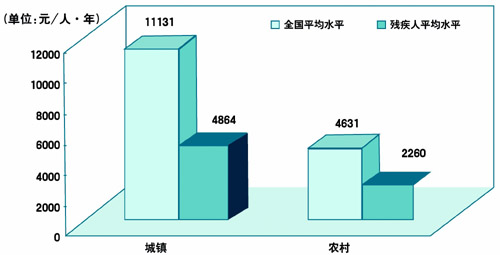 全国有残疾人的家庭户2005年人均全部收入,城镇为4864元,农村为2260元。12.95%的农村残疾人家庭户年人均全部收入低于683元,7.96%的农村残疾人家庭户年人均全部收入在684元至944元之间。