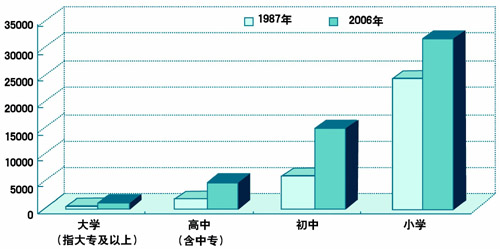 全国残疾人口中,具有大学程度(指大专及以上)的残疾人为94万人,高中程度(含中专)的残疾人为406万人,初中程度的残疾人为1248万人,小学程度的残疾人为2642万人(以上各种受教育程度的人包括各类学校的毕业生、肄业生和在校生)。