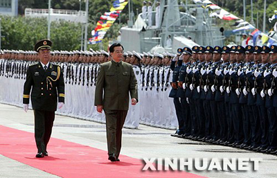 10时许,胡锦涛乘车抵达昂船洲海军基地北码头。码头上,等待检阅的官兵们身着新换发的军装,士气高昂,军容严整。在雄壮的阅兵曲中,胡锦涛走到军旗前,向军旗行注目礼,随后检阅了驻港部队。胡锦涛对受阅官兵们表示亲切问候,官兵们以响亮的回答感谢胡主席的关怀。