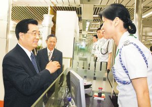 开通仪式结束后,胡锦涛来到出入境柜台,同港方和深方工作人员亲切交谈,仔细询问口岸通关的准备工作情况。