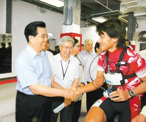 “主席,这位就是黄金宝。”香港体育学院主席李家祥向胡锦涛介绍正在器械上进行体能训练的香港著名自行车运动员黄金宝。胡锦涛走上前去,亲切地同黄金宝握手,仔细询问训练情况,勉励他在比赛场上再创佳绩。