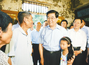 7月21日至22日,中共中央总书记、国家主席、中央军委主席胡锦涛在重庆市考察工作,看望受灾群众。这是胡锦涛在沙坪坝区回龙坝镇梁滩桥村冯洪元家中了解受灾情况,鼓励他们增强战胜灾害的决心和勇气,尽快恢复生产、重建家园。