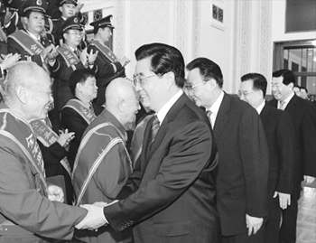 在热烈的掌声中,胡锦涛发表了讲话。他首先代表党中央、国务院和中央军委,向战斗在保卫祖国、建设祖国各个岗位上的人民解放军指战员、武警部队官兵、预备役军人和广大民兵致以节日的祝贺,向为中国革命、建设、改革事业作出重大贡献的军队离退休老同志表示诚挚的问候,向在各个时期为人民解放军建设作出贡献的转业退伍军人、革命伤残军人和烈军属表示亲切的慰问,向在国防科技工业战线顽强拼搏的科学家、工程技术人员和广大干部职工致以衷心的感谢,向出席全军英雄模范代表大会的代表致以热烈的祝贺,向长期以来关心和支持人民解放军建设的全国各族人民致以崇高的敬意。