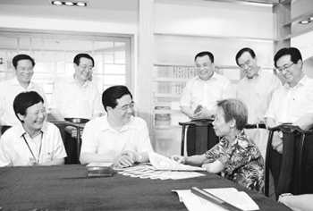 7月28日至29日,中共中央总书记、国家主席、中央军委主席胡锦涛和随行的中共中央政治局候补委员、中央书记处书记、中央办公厅主任王刚,在浙江省委书记赵洪祝、省长吕祖善等陪同下,冒着酷暑,深入杭州的企业和社区,就贯彻落实科学发展观、加强党的建设进行调查研究。