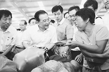 接着,温家宝又来到蔬菜批发市场,挨个同来自各地的从事蔬菜批发经营的农民交谈,问他们蔬菜销售的价格情况和在北京的生活情况。