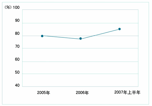 一是食品总体合格率稳步提升。2006年全国食品国家监督抽查合格率达到77.9%。2007年上半年,食品专项国家监督抽查合格率达到了85.1%。食品质量安全水平保持稳定,并呈上升态势(见图2)。
