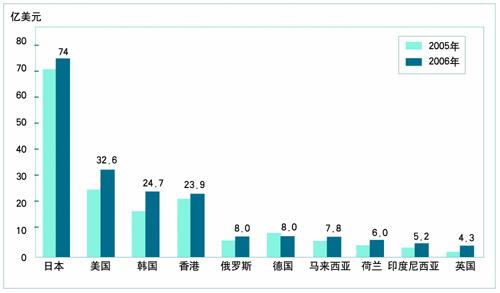 中国食品出口到200多个国家和地区,按贸易额排序前10位的国家和地区依次是:日本、美国、韩国、香港、俄罗斯、德国、马来西亚、荷兰、印度尼西亚、英国(见图6)。