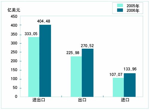 中国是食品进出口大国,多年来食品进出口不断增长。2006年,食品进出口贸易总额为404.48亿美元(不包括小麦、玉米、大豆等农产品,下同),同比增长了21.45%(见图4)。