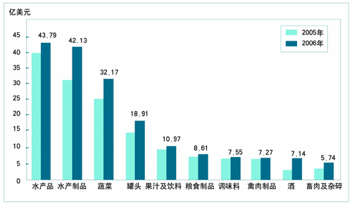 2006年,中国出口食品2417.3万吨,货值266.59亿美元,同比分别增长了13.29%和16.0%;出口食品货值列前10位的品种分别为:水产品、水产制品、蔬菜、罐头、果汁及饮料、粮食制品、调味料、禽肉制品、酒、畜肉及杂碎(见图5)。