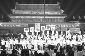 当晚,天安门城楼华灯齐放,流光溢彩。天安门广场成为歌舞的海洋,欢乐的海洋。中共中央政治局委员、北京市委书记、北京奥组委主席刘淇,国务委员、国务院秘书长华建敏,国务委员、北京奥组委第一副主席陈至立,国际奥委会主席罗格等,也和首都各界群众1万人欢聚一堂。