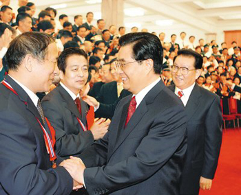 人民大会堂北大厅,一片欢声笑语。胡锦涛等领导同志与全国道德模范一一握手,亲切交谈,并合影留念。