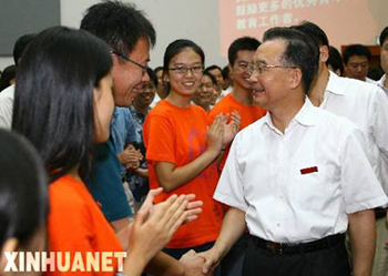 黄婷同学来自云南普洱,就在今年高考前那里发生了较大的地震。她表示,自己想四年后回到家乡,为灾区重建特别是教育事业的发展贡献自己的力量。总理勉励她好好学习,并请她向灾区人民带去亲切的问候。来自深圳的刘贺同学则告诉总理,家乡经济很发达,但少数学生面对各种诱惑,无心学习。听到这里,总理十分郑重地告诫大家:“外面的世界五光十色,诱惑确实很大。但同学们必须要坚守心里的道德底线,必须有正确的人生观、世界观,把自己的一切献给社会、献给人民、献给祖国。只要怀着极大的社会责任感去学习、工作,我们的生活就会是多彩的,我们的精神就会是高尚的。”