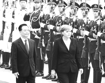 会谈前,温家宝在人民大会堂东门外广场举行仪式,欢迎默克尔访华。民建中央副主席马培华、外交部部长杨洁篪、国家发展改革委主任马凯、文化部部长孙家正、中国驻德国大使马灿荣等出席了欢迎仪式。
