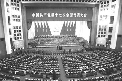 雄伟的人民大会堂大礼堂,气氛隆重热烈。主席台上方悬挂着“中国共产党第十七次全国代表大会”的会标,后幕正中是镰刀和锤头组成的党徽,10面鲜艳的红旗分列两侧。二楼和三楼的眺台上分别悬挂着“高举中国特色社会主义伟大旗帜,以邓小平理论和‘三个代表’重要思想为指导,深入贯彻落实科学发展观,为夺取全面建设小康社会新胜利而奋斗!”“伟大、光荣、正确的中国共产党万岁!”的横幅。