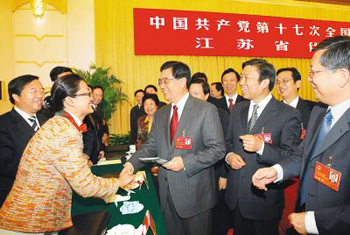 在大家发言后,胡锦涛以江苏代表团一名代表的身份,就如何学习领会党的十七大报告作了发言。他指出,党的十七大报告是坚持走群众路线、充分发扬民主的产物,是全党全国各族人民智慧的结晶。我相信,经过大会讨论修改,党的十七大报告一定能够成为我们党团结带领全国各族人民坚定不移走中国特色社会主义道路、在新的历史起点上继续发展中国特色社会主义的政治宣言和行动纲领。