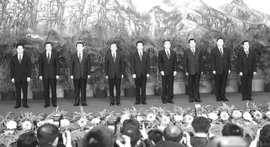 人民大会堂东大厅华灯璀璨,鲜花绽放,气氛热烈庄重。600多名中外记者早早来到这里。他们架起一排排摄像机、照相机,手持录音机、采访本,等待着新一届中共中央政治局常委会组成人员的到来。