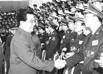 10月22日晚,中共中央总书记、国家主席、中央军委主席胡锦涛在京西宾馆亲切会见了解放军和武警部队出席党的十七大全体代表。