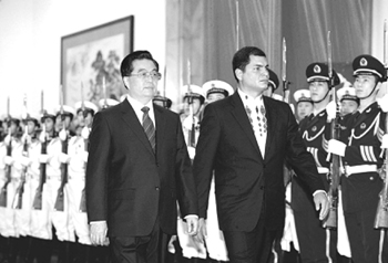 会谈前,胡锦涛主席在人民大会堂北大厅为科雷亚总统访华举行欢迎仪式。全国人大常委会副委员长许嘉璐、国务委员唐家璇、全国政协副主席阿不来提·阿不都热西提、民建中央常务副主席陈昌智、外交部副部长戴秉国等出席欢迎仪式。
