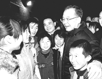 听说孩子们学习都非常努力、成绩也不错,总理脸上露出笑容。他对孩子们说:“我来看你们,因为我惦记着你们。你们很不幸,从小失去了父母。但你们也很幸运,全国有很多人关心爱护你们,你们还有其他的亲人,还有更多的亲人。”温家宝略微停顿,加重了语气,“你们正是长身体、学知识的时候,希望你们走出失去父母的阴影。要记住一句话,‘大地总是光明的,太阳总会出来的’。要让世界充满阳光,让社会充满阳光,让孩子们的心灵充满阳光。艰难的童年是你们一生中的磨练时期,这使你们懂事早,懂得生活的艰难。你们要更加努力学习,把自己培养锻炼成一个对人民、对国家、对社会有用的人。”