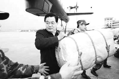 (图片说明:胡锦涛同正在执行救灾任务的广州军区某集团军陆航团的官兵一起装运救灾物资。新华社发)