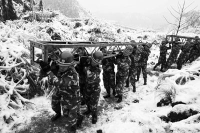 2月10日,胡锦涛作出重要指示,要求部队在前一段积极投身抢险救灾斗争的基础上,继续支持受灾地区搞好恢复重建,为夺取抗灾救灾全面胜利作出更大贡献。中央军委对部队支援灾区恢复重建工作迅速作出部署。