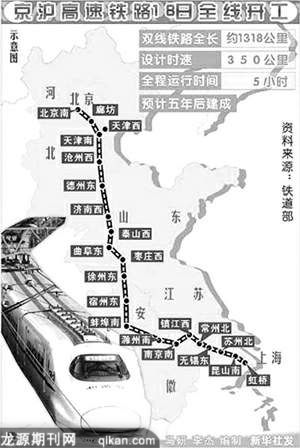 京沪高速铁路自北京南站至上海虹桥站,新建双线铁路全长1318公里,是世界上一次建成线路最长、标准最高的高速铁路,是新中国成立以来一次投资规模最大的建设项目。它贯穿北京、天津、河北、山东、安徽、江苏、上海七省市,连接环渤海和长江三角洲两大经济区,设计时速350公里,总投资2209.4亿元,总工期为5年左右。项目建成后,乘坐火车从北京至上海只需要5个小时。