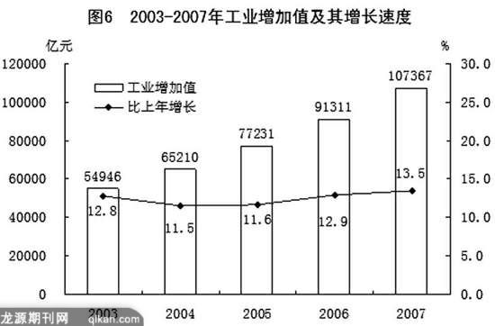全年规模以上工业中,煤炭开采和洗选业增加值比上年增长18.1%,石油和天然气开采业增长3.9%,纺织业增长16.2%,农副食品加工业增长16.9%,通用设备制造业增长24.2%,交通运输设备制造业增长26.2%,通信设备、计算机及其他电子设备制造业增长18.0%,电气机械及器材制造业增长21.5%。6大高耗能行业比上年增长18.9%,其中,非金属矿物制品业增长24.7%,黑色金属冶炼及压延加工业增长21.4%,化学原料及化学制品制造业增长21.0%,有色金属冶炼及压延加工业增长17.8%,电力热力的生产和供应业增长13.8%,石油加工炼焦及核燃料加工业增长13.4%。高技术产业增加值比上年增长17.8%。