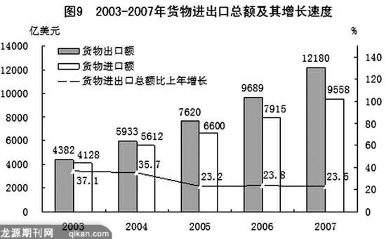 全年货物进出口总额21738亿美元,比上年增长23.5%。其中,货物出口12180亿美元,增长25.7%;货物进口9558亿美元,增长20.8%。出口大于进口2622亿美元,比上年增加847亿美元。